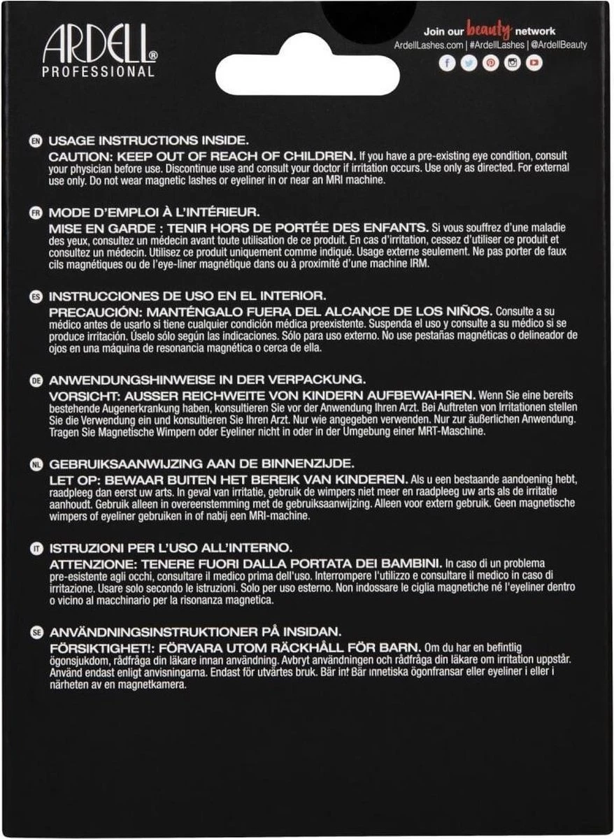 Let op: buiten het bereik van kinderen houden. Raadpleeg voor gebruik je arts als je een reeds bestaande oogaandoening hebt. Stop het gebruik en raadpleeg je arts als irritatie optreedt. Gebruik alleen zoals aangegeven. Alleen voor uitwendig gebruik. Draag geen magnetische wimpers of eyeliner in of nabij een MRI-machine.