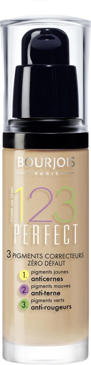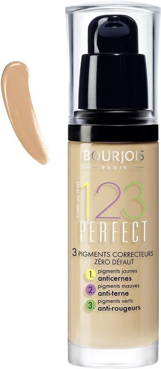 Begin de dag met de Bourjois 123 Perfect foundation voor een flawless uitstraling die tot wel 16 uur blijft. De innovatieve formule gecombineerd met 2 correctie pigmenten zorgen voor een flawless huid zonder imperfecties: 1. Geel pigment om donkere kringen te maskeren; 2 Mauve pigmenten om vermoeidheid te corrigeren en de uitstraling een boost te geven; 3 Groene pigmenten om roodheid te neutraliseren voor een gelijkmatige afwerking. Blend met de hand voor een streepvrije afwerking of gebruik een sponsje voor die stralende airbrush-look. Één laag biedt een gemiddelde dekking, maar kan worden opgebouwd zonder cakey te worden. Voor een flawless, halfmatte afwerking die zelfs de grauwste teint oplicht en blijft gedurende de dag… Bourjois 123 Perfect make up foundation verdient een plekje op je top 10 lijst van schoonheidsgeheimen.