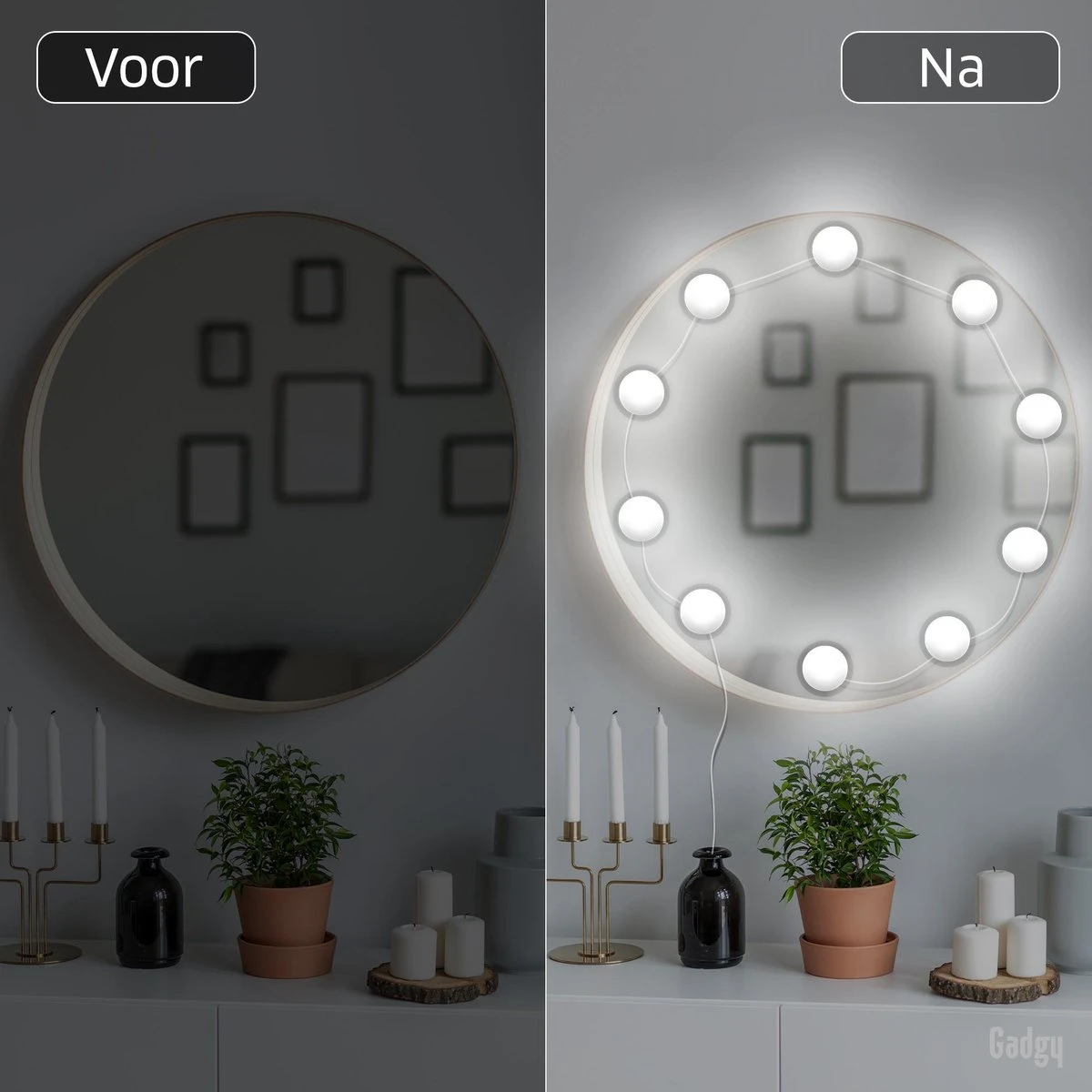 Bevestig de lampen met de zuignapjes of 3M tape gewoon op het gewenste oppervlak, sluit de USB stekker aan en ze zijn klaar voor gebruik. Zo transformeer je je gewone spiegel in een echte Hollywood spiegel. Leuk voor in de slaap of badkamer, maar ook voor in de hal of woonkamer!