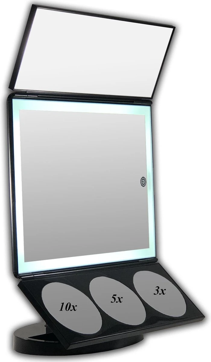 strakke en uiterst handige drieluik make-up spiegel. De make up spiegel is een stuk groter dan zijn voorganger. Deze spiegel beschikt over 1x (normaal) 3x 5x en 10x vergroting zodat er altijd een vergroting voor jou bij zit. Het licht is deze keer strak verwerkt in de randen met een mooie witte lijn die fel oplicht en hierdoor een helder wit daglicht afgeeft voor een perfect resultaat. Ook kunt u de spiegel gemakkelijk dimmen door de touch knop langer ingedrukt te houden. De spiegel word geleverd met USB kabel zodat de spiegel mobiel is maar ook op een vaste plek neergezet kan worden. Ook is die spiegel kantelbaar zodat deze ook op een lager tafeltje te gebruiken is.