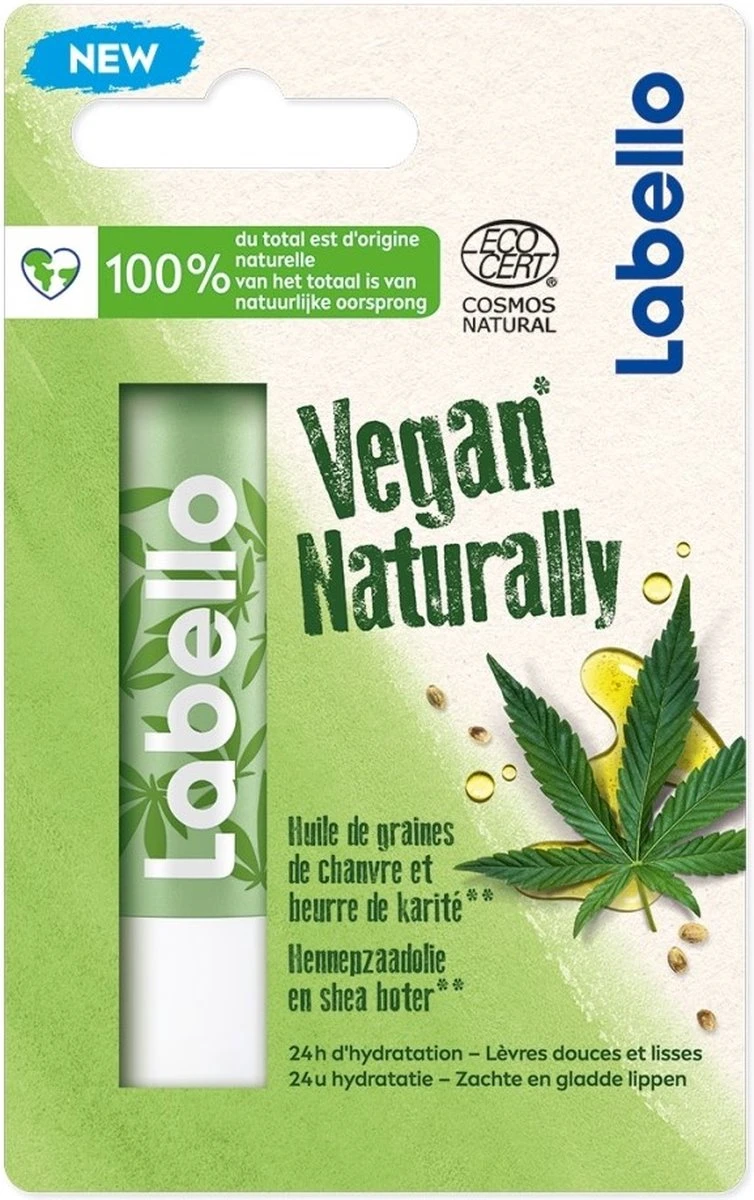 Labello Vegan Naturally Hennepzaadolie / Huile De Graines De Chanvre / Hemp Seed Oil, verzorgende lippenbalsem met een frisse hennep geur en een subtiele glans.
