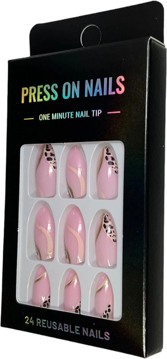 Nepnagels in de kleur Roze met goud. Deze set bevat 24 nagels in 12 verschillende afmetingen. Zo passen ze dus altijd perfect op jouw natuurlijke nagels.