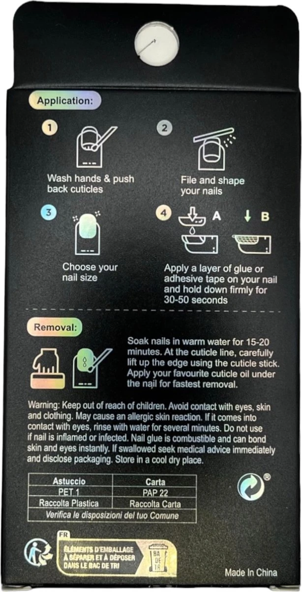- Breng nu de nagel stickers óf nagellijm aan. Lijm biedt een langer resultaat, echter kan dit de eigen nagels beschadigen.