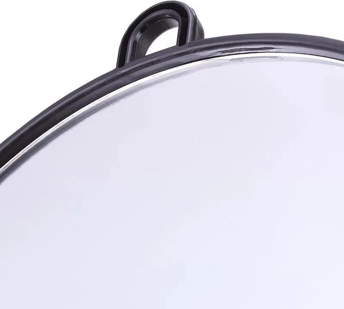 Deze kappersspiegel is een ronde spiegel met handgreep in de kleur zwart.
