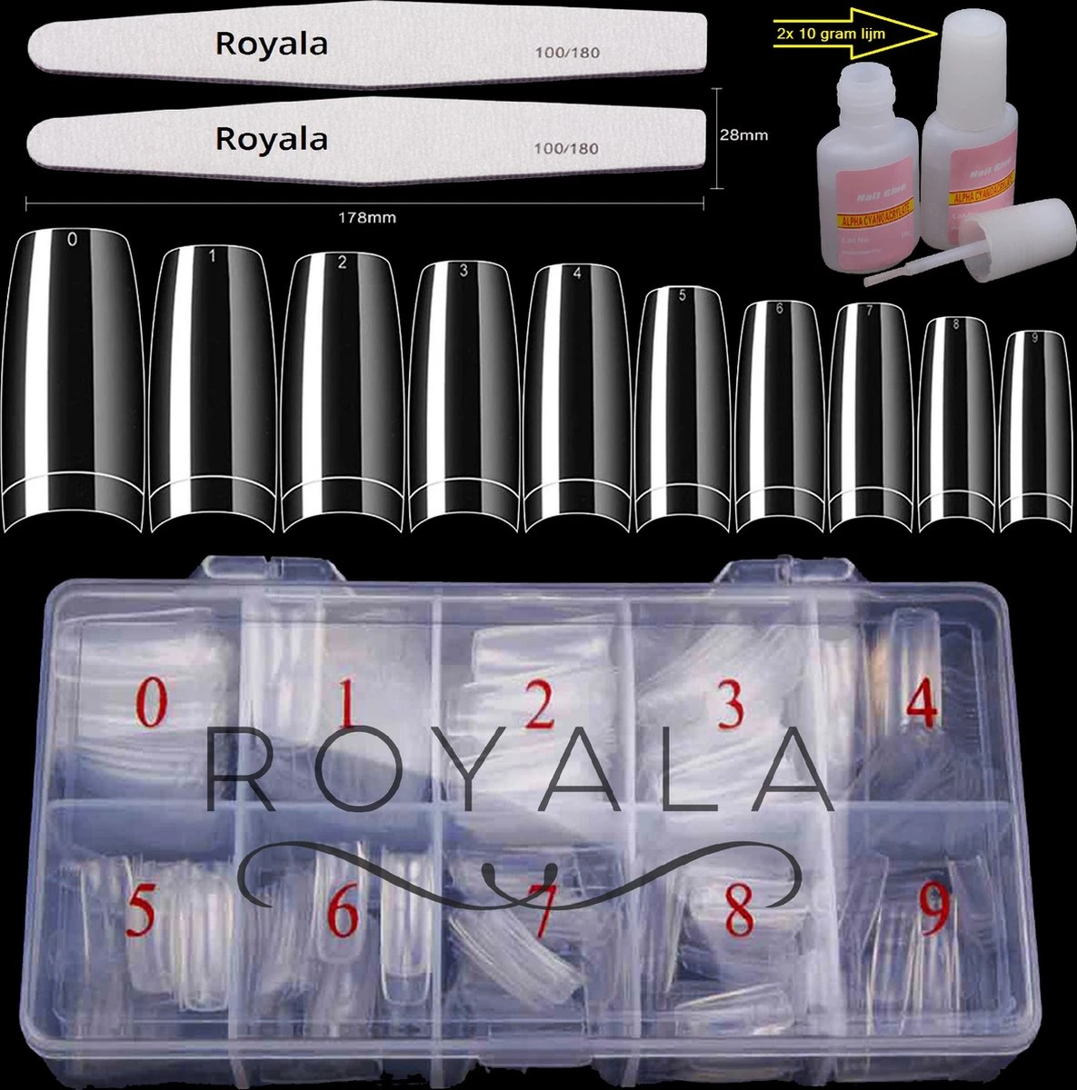 1. — Royala 500 stuks Transparante / Clear / Heldere French, Half Cover, Nageltips in 10 verschillende maten voor het creeëren van de perfecte kunstnagels. Geschikt voor gebruik van zowel gellak als acryl.
